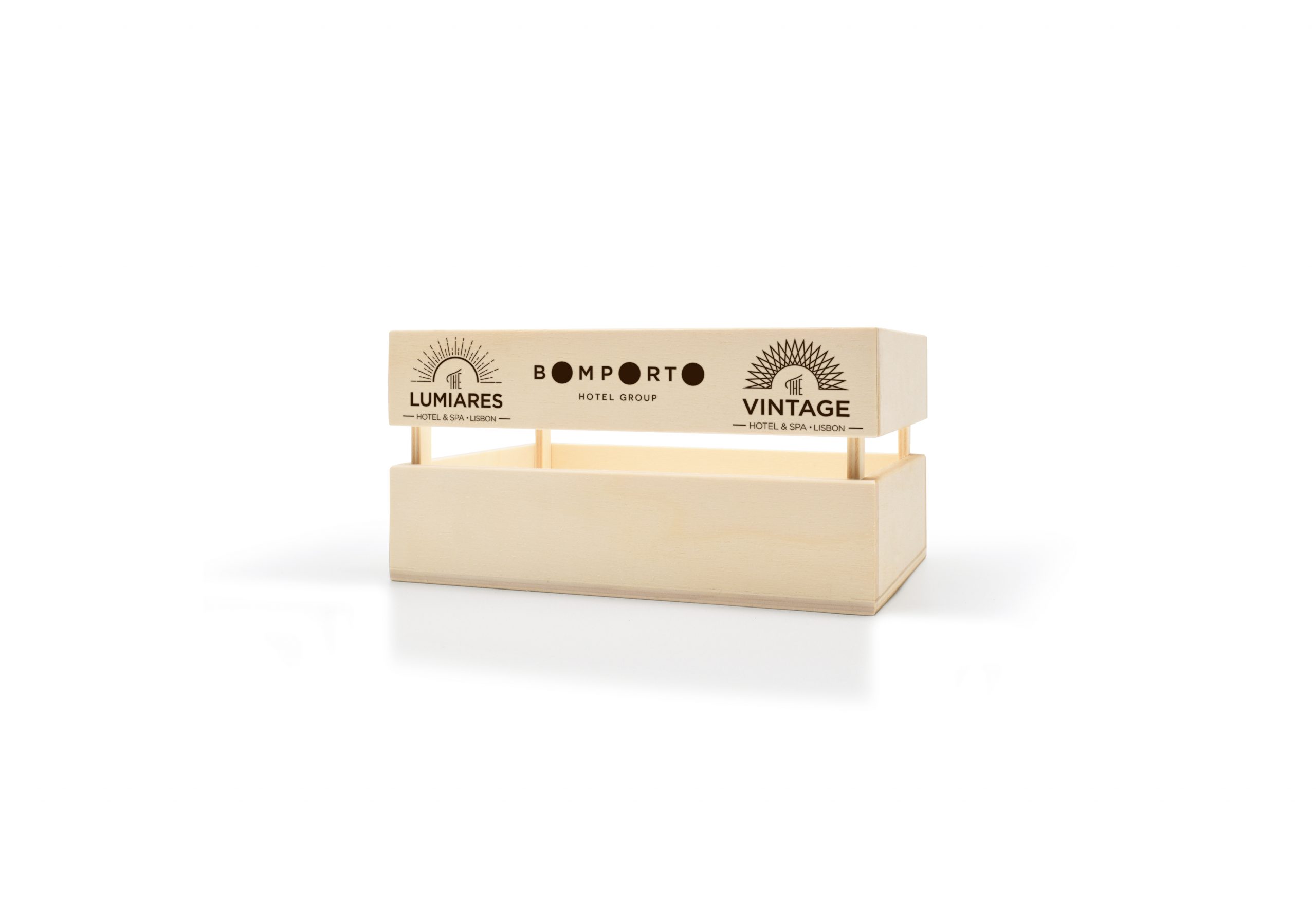 Caixa de madeira com ripas para o hotel BOMPORTO. Caixa de madeira sem tampa, com personalização a quente.